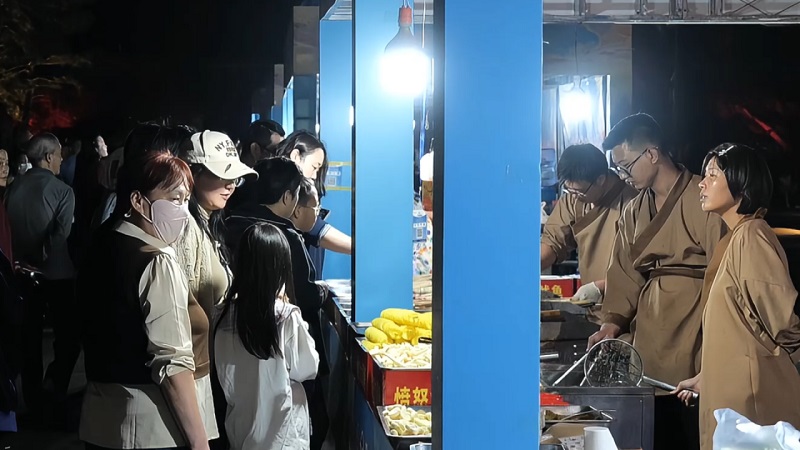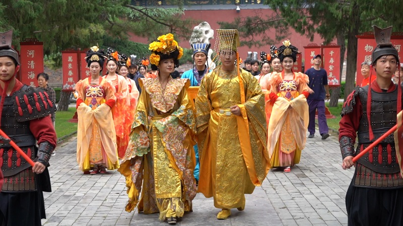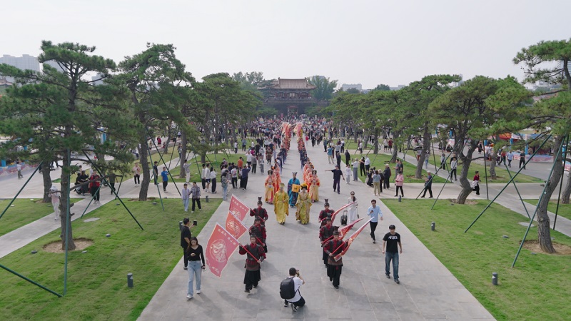 本次文化旅游節活動自10月1日持續至10月5日,活動期間設置了主題鮮明、層次豐富的特色內容。每日10時,來自中華泰山·封禪大典的演藝團隊以《萬國來朝·盛世啟市》主題演出拉開序幕。天鼓初鳴之際,悠遠號角與鏗鏘鼓點交織共鳴,依次呈現開場迎賓禮、司禮官肅穆登場、舞姬書生伴唐宮人物(李治、武則天)盛裝巡游。巡游結束后,演員們將化身隱藏NPC,身著唐宮華服扮演“帝王”“貴妃”等角色,與游客展開對詩猜謎、合影互動等環節
