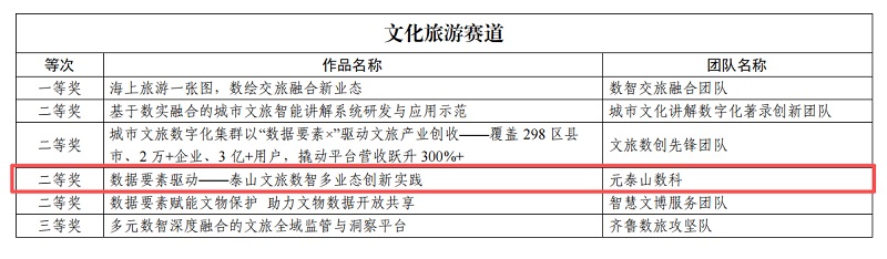 近日,由山東省大數據局、中共山東省委網絡安全和信息化委員會辦公室、共青團山東省委等多部門聯合主辦的2025年“數據要素×”大賽山東分賽圓滿落幕。泰山文旅集團子公司元泰山數字科技有限責任公司憑借“數據要素驅動——泰山文旅數智多業態創新實踐”項目,從眾多參賽作品中脫穎而出,獲文化旅游賽道二等獎。